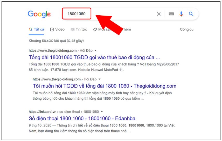 Ví dụ: Khi bạn tìm kiếm số 18001060, Google sẽ trả cho bạn kết quả là số tổng đài của Thế Giới Di Động.