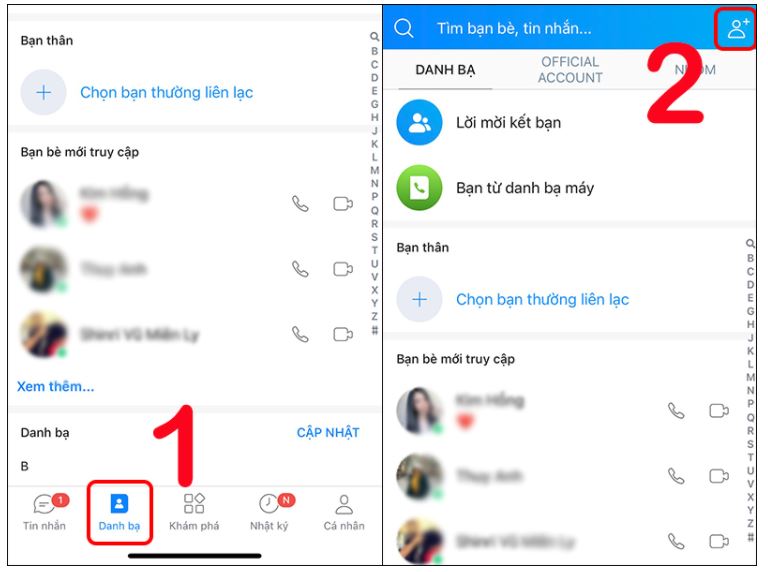 – Bước 1: Vào Zalo > Nhấn vào biểu tượng Danh bạ > Chọn vào biểu tượng kết bạn ở trên cùng góc phải màn hình.