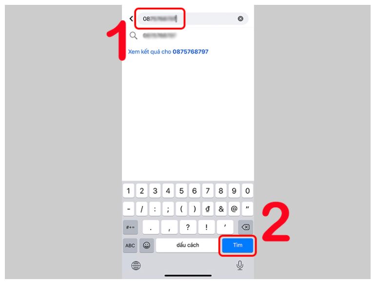 – Bước 2: Chọn Tìm kiếm > Nhập số điện thoại cần tìm > Nhấn vào biểu tượng tìm kiếm.