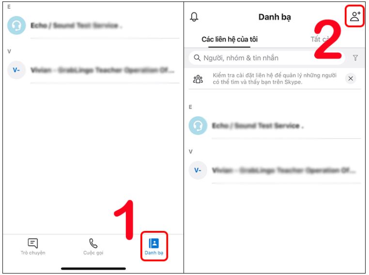 – Bước 1: Vào Skype > Chọn Danh bạ > Nhấn chọn biểu tượng thêm bạn ở góc phải màn hình.
