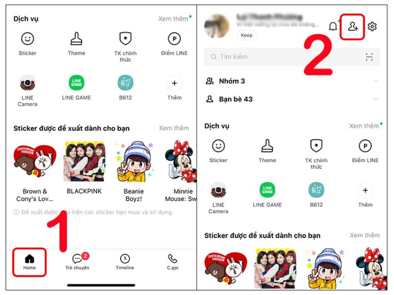 – Bước 1: Vào ứng dụng Line > Chọn Home > Nhấn vào biểu tượng thêm bạn.