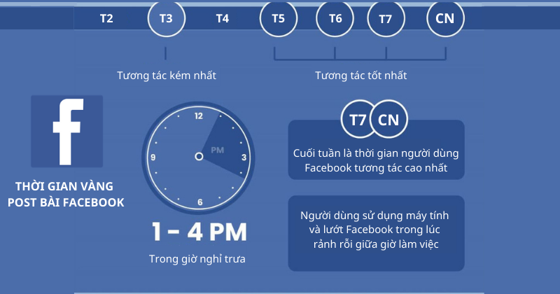 Nếu ảnh đẹp lung linh mà đăng sai khung giờ thì lượt like của bạn cũng sẽ không cao. Vì vậy, bạn nên đăng ảnh vào các “thời điểm vàng” như 7h sáng; 11h -12h trưa; 19h – 21h tối, và đặc biệt nên đăng vào buổi trưa các ngày cuối tuần như tứ 5, 6,7. Bởi đây là thời gian mọi người nghỉ ngơi và có xu hướng lướt Facebook nhiều hơn.