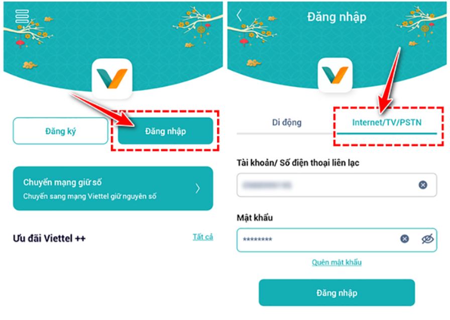 Bước 1: Truy cập vào ứng dụng My Viettel > Chọn mục Đăng nhập > Chọn thẻ Internet/TV/PSTN