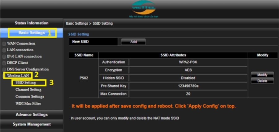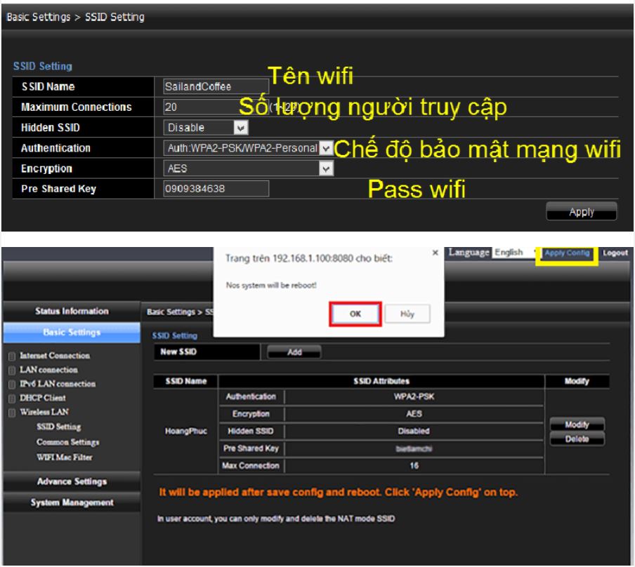 • Thay đổi mật khẩu, cấu hình mạng > Chọn Apply Config để đổi mật khẩu Wifi Viettel