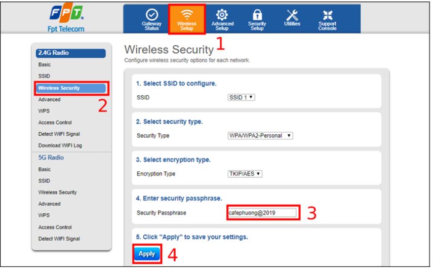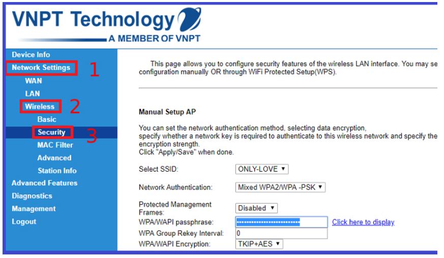 • Nhấn vào Apply/Saveđể đổi mật khẩu WiFi VNPT.