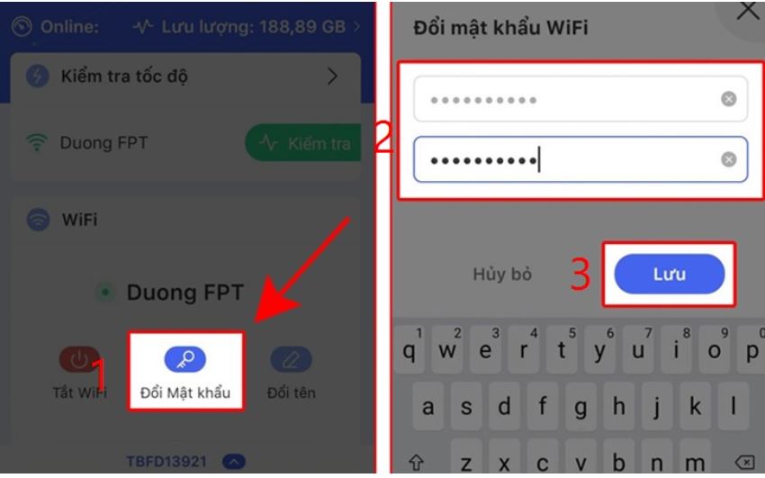 Bước 4: Nhấn Đổi Mật khẩu > Nhập mật khẩu WiFi mới vào 2 khung như hình > Nhấn Lưu.