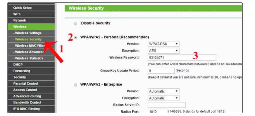 Bước 3: Chọn mục Wireless Security, mục này hiển thị các thông số liên quan đến bảo mật của pass WiFi.