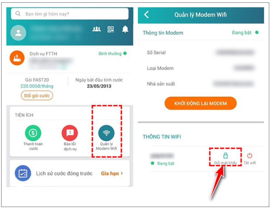 • Chọn vào mụcQuản lý Modem Wifi > Chọn vào mục Đổi mật khẩu.