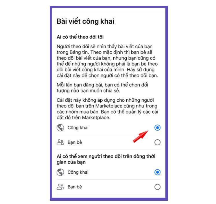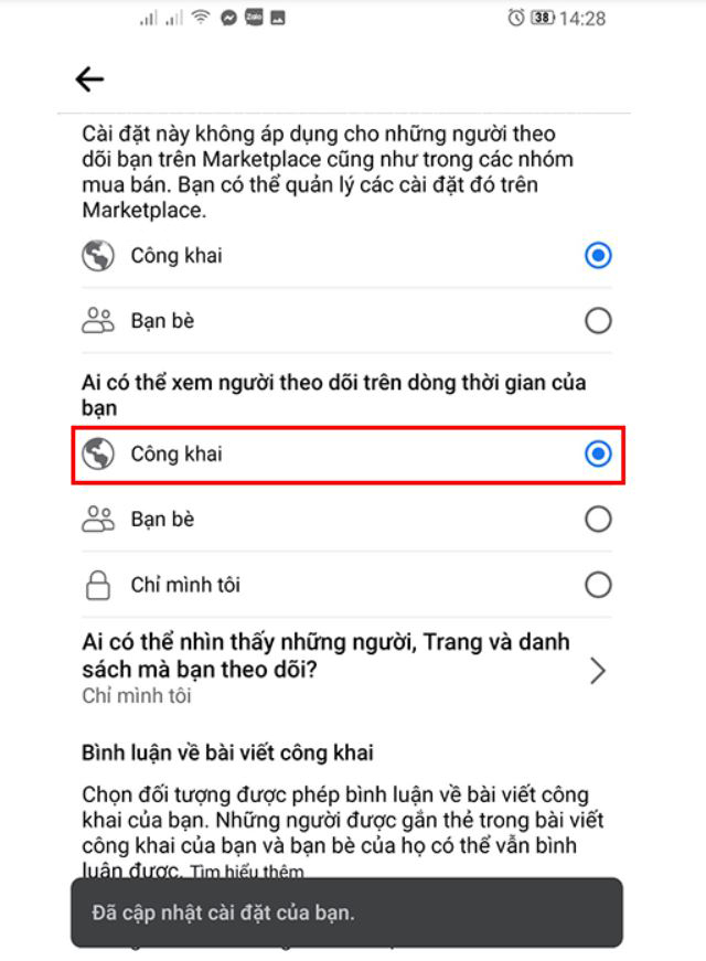 Bước 5: Tại mục Ai có thể theo dõi tôi, chọn Công khai để bật nút theo dõi trên Facebook thành công.