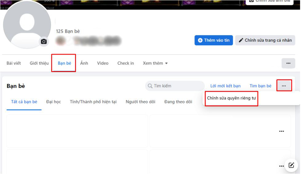 Bước 1: Trên trang cá nhân của bạn, hãy nhấn vào mục Bạn bè. Tiếp tục nhấn vào nút Ba chấm ở góc dưới, chọn Chỉnh sửa quyền riêng tư.
