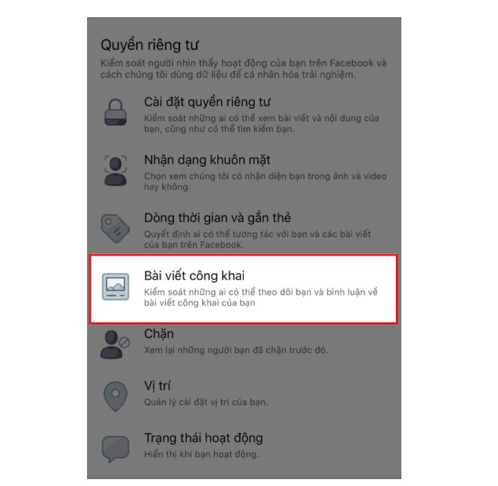 - Lướt đến mục Quyền riêng tư> Chọn Bài viết công khai.