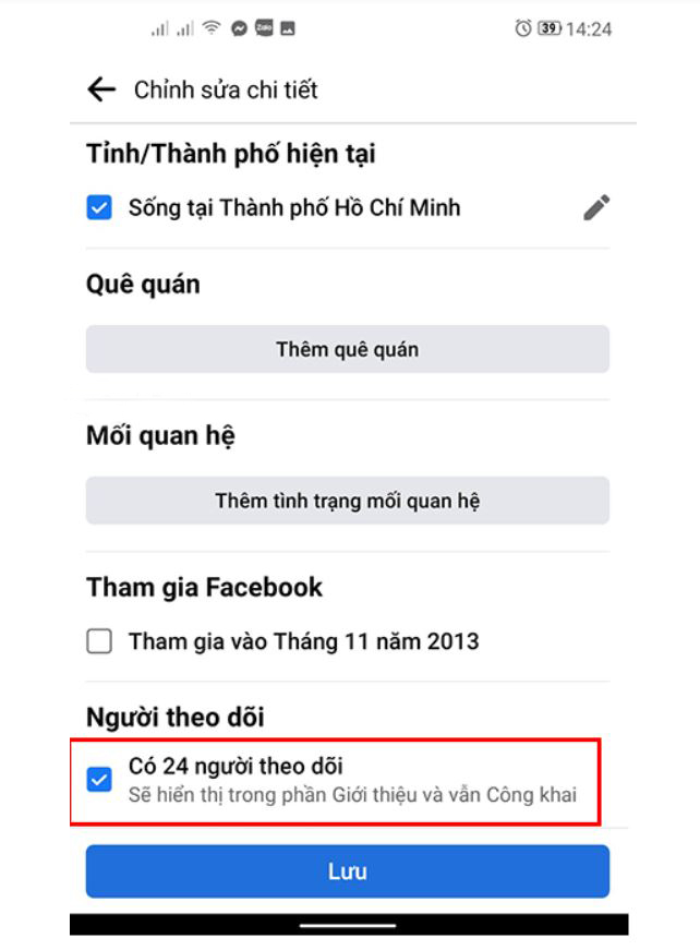 Bước 3: Đánh dấu vào ô Có … người theo dõi sau đó nhấn Lưu.