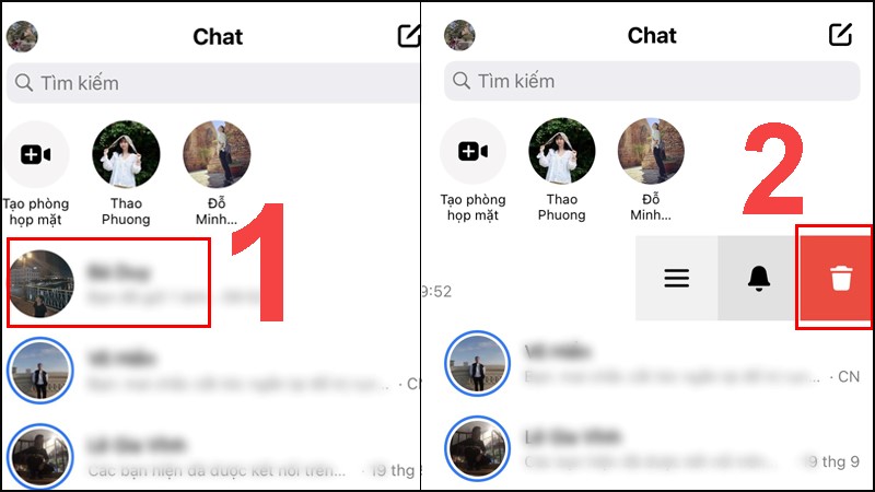 Bước 2: Tại cuộc hội thoại muốn xóa, lấy tay vuối tin nhắn từ phải sang trái>> Chọn biểu tượng thùng rác.