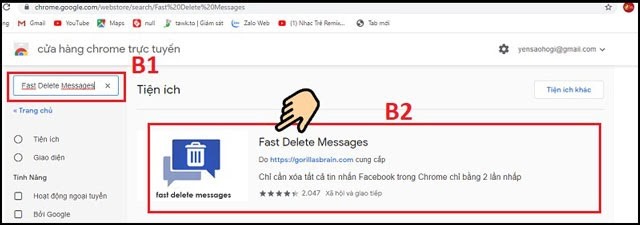Bước 1: Mở trình duyệt Chrome và truy cập vào Cửa hàng Chrome trực tuyến. Tại khung tìm kiếm từ khoá các bạn nhập Facebook Fast Delete Messages và nhấn Enter để tìm kiếm.