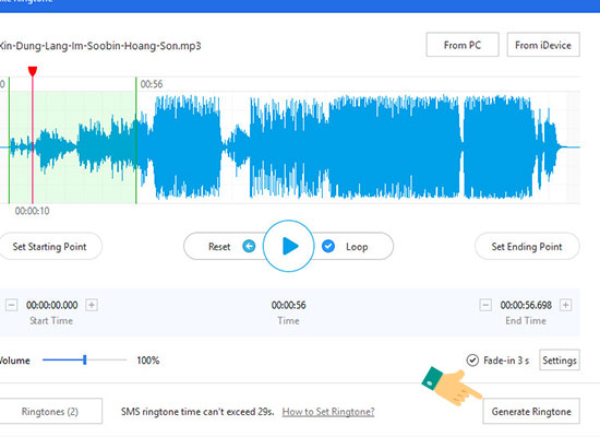 Bước 6: Tuỳ chỉnh độ dài bài hát theo sở thích để làm nhạc chuông bằng cách kéo 2 đầu mút ở 2 đầu bản nhạc.
