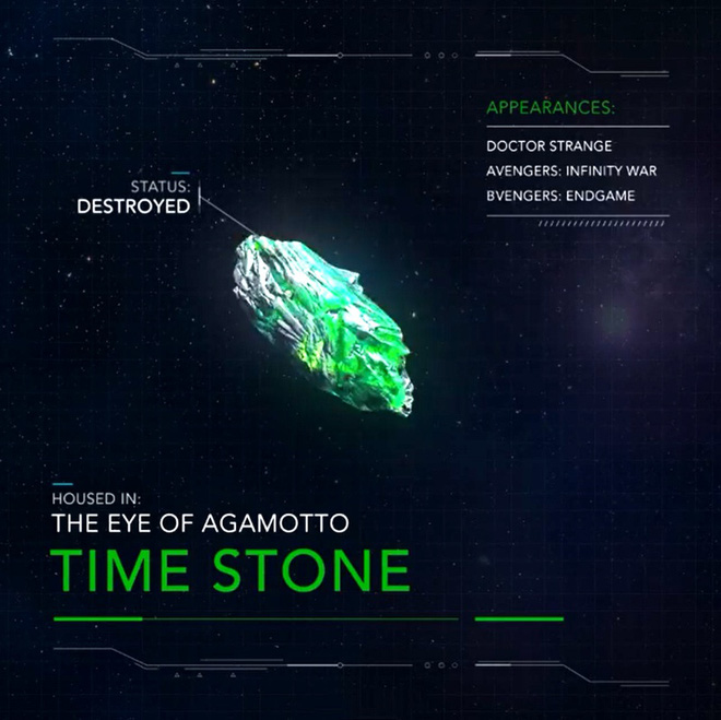 Năm 2014: Viên đá Thời gian lần đầu xuất hiện trong hologram ở phim Vệ binh dải ngân hà. Năm 2018, Stephen Strange đã giao Viên đá lại cho Thanos để cứu tính mạng của Tony Stark.