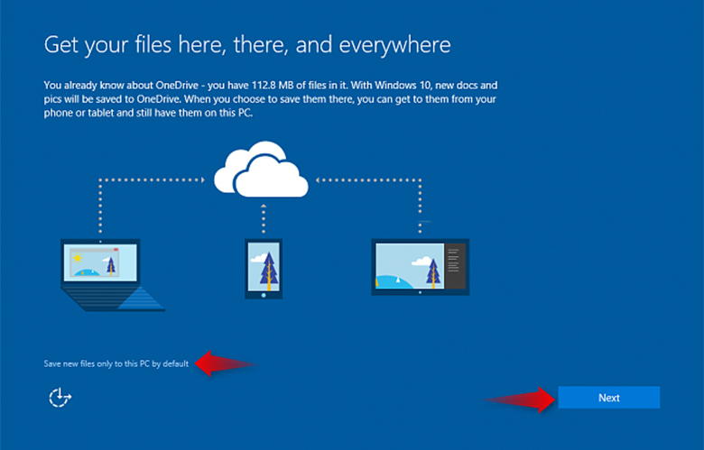 - Ấn Next nếu sử dụng OneDrive cùng tài khoản Microsoft. Nếu không muốn hãy chọn Save new files only to this PC by default.