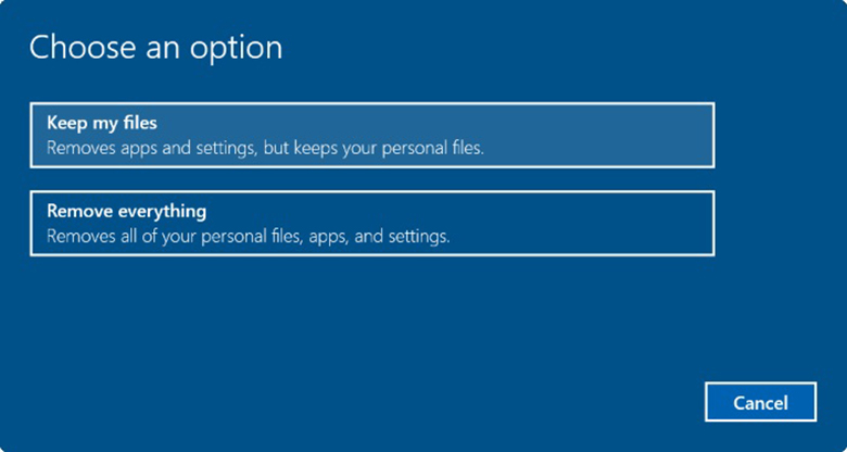 Bước 5: Bạn sẽ nhìn thấy 2 tùy chọn Keep my files và Remove everything hiển thị trong hộp thoại Choose an option, bạn click chuột vào Keep my files để xóa toàn bộ ứng dụng, cài đặt đã thiết lập trên máy tính để trở về ban đầu nhưng giữ lại file cá nhân.