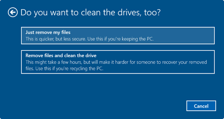 - Remove files and clean the drive: Chọn cái này để xóa mọi dữ liệu nếu sau khi cài đặt lại win 10 bạn muốn bán máy, cho hoặc tặng máy cho người khác để người khác không thể phục hồi các file đã bị xóa thông qua lựa chọn này.