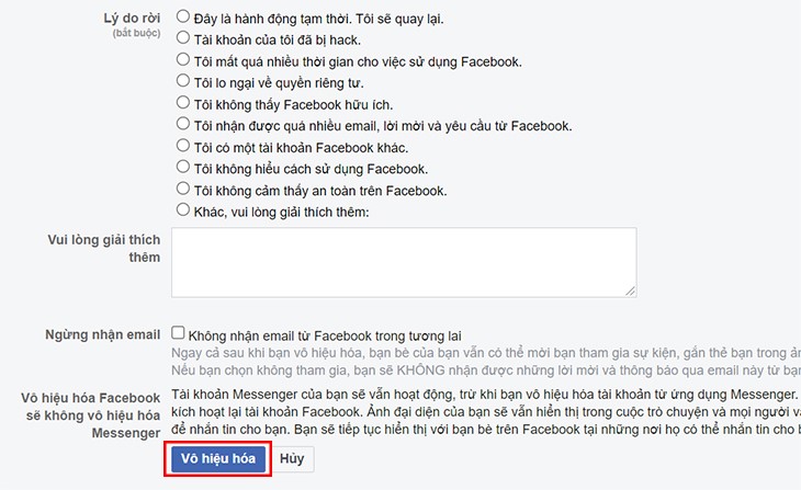Bước 6: Chọn lý do bạn muốn vô hiệu hóa tài khoản > Chọn Vô hiệu hóa. Bước 7: Trên màn hình hiển thị hộp thoại thông báo Bạn có chắc muốn vô hiệu hóa tài khoản cả mình không để xác nhận việc vô hiệu hóa tài khoản, bạn chọn Vô hiệu hóa ngay là hoàn tất việc khóa Fb tạm thời trên máy tính.