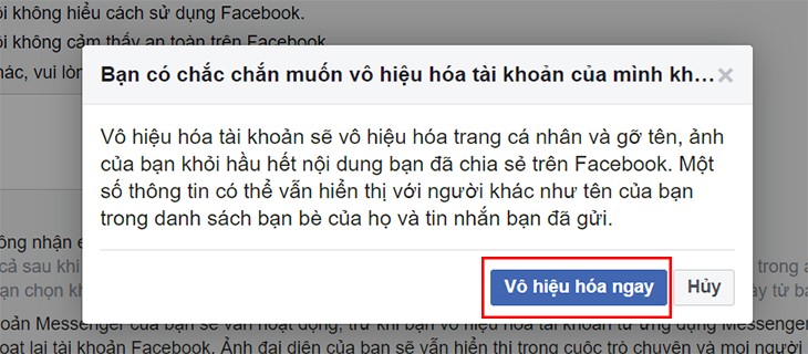 Bước 7: Trên màn hình hiển thị hộp thoại thông báo Bạn có chắc muốn vô hiệu hóa tài khoản cả mình không để xác nhận việc vô hiệu hóa tài khoản, bạn chọn Vô hiệu hóa ngay là hoàn tất việc khóa Fb tạm thời trên máy tính.
