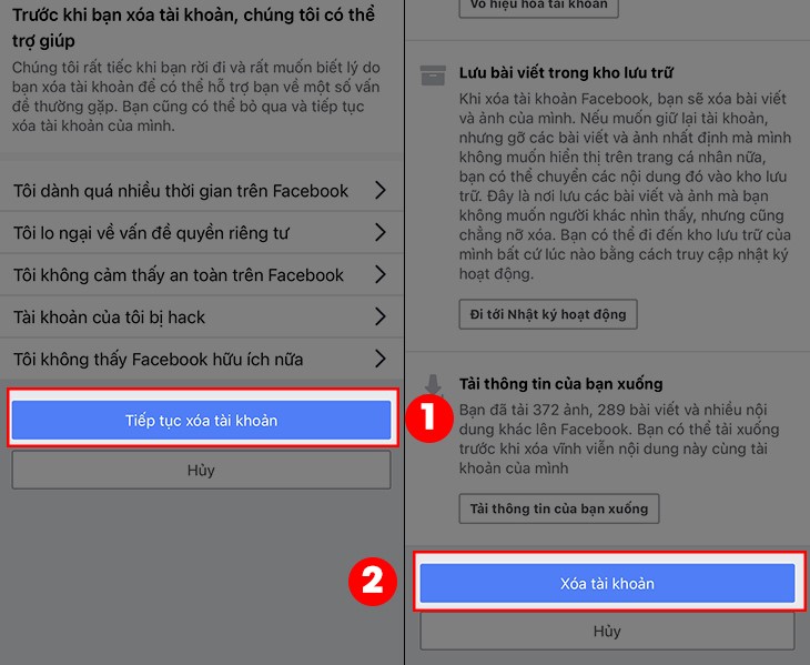 Bước 4: Chọn mục Xóa tài khoản > Chọn Tiếp tục xóa tài khoản. Bước 5: Tại đây, bạn có thể tải về những thông tin trên Facebook gồm ảnh, bài viết và các nội dung khác. Sau đó chọn vào Xóa tài khoản.