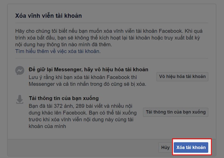 – Mọi thông tin, nội dung trên tải khoản Facebook của bạn đều bị xóa vĩnh viễn.