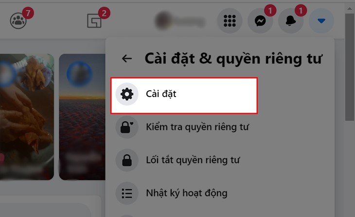Bước 1: Vào trình duyệt web và đăng nhập Facebook. Tại góc phải màn hình, chọn biểu tượng tam giác ngược > Chọn Cài đặt & quyền riêng tư. Bước 2: Chọn vào Cài đặt.