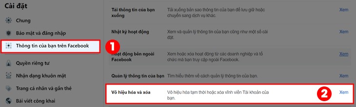 Bước 3: Chọn phần Thông tin của bạn trên Facebook > Tại mục Vô hiệu hóa và xóa, bạn click và Xem. Bước 4: Lúc này bạn chọn Vô hiệu hóa tài khoản > Chọn Tiếp tục vô hiệu hóa tài khoản.