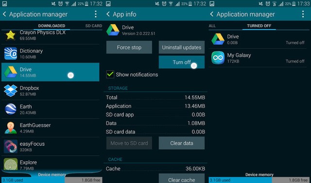 Để gỡ ứng dụng thuộc nhóm bloatware, bạn hãy truy cập vào Settings > Application manager. Nhấn chọn ứng dụng muốn gỡ bỏ và chọn tiếp “Disable” hoặc “Turn off” để vô hiệu hóa nó. Sau khi tắt, ứng dụng sẽ được loại bỏ khỏi app drawer, hệ thống cũng sẽ xóa bỏ dữ liệu người dùng của nó nên bạn có thể yên tâm. Trong trường hợp nếu muốn bật lại, bạn hãy thực hiện thao tác tương tự.