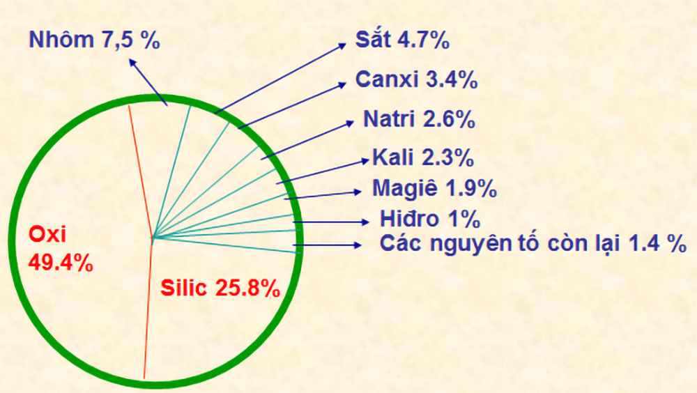 - Không phải tất cả các nguyên tố có trong bảng tuần hoàn đều có trong lớp vỏ của Trái Đất. Tỷ lệ các nguyên tố trong vỏ Trái Đất cũng có sự khác biệt rất lớn. Trong đó, oxi là nguyên tố phổ biến nhất hiện nay, chúng chiếm gần 1 nửa khối lượng của Trái Đất. Tiếp theo là đến nguyên tố silic, nhôm, sắt, canxi, natri, kali, magiê, hydro, titan, cacbon, clo; tổng cộng chúng chiếm khoảng 99,47% trọng lượng vỏ Trái Đất. Còn những nguyên tố còn lại ước tính chỉ chiếm khoảng 0,35%.